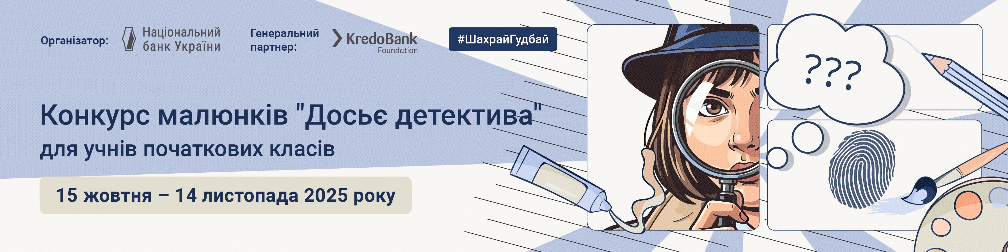 Запрошуємо учнів початкових класів та педагогів із 15 жовтня до 14 листопада 2025 року взяти участь у конкурсі малюнків «Досьє детектива». Під керівництвом педагогів діти створюватимуть малюнки у вигляді детективної справи про платіжну безпеку, а також дізнаються, як безпечно користуватися платіжними картками, паролями, здійснювати онлайн-платежі і перетворюватимуть свої знання на креативні історії.