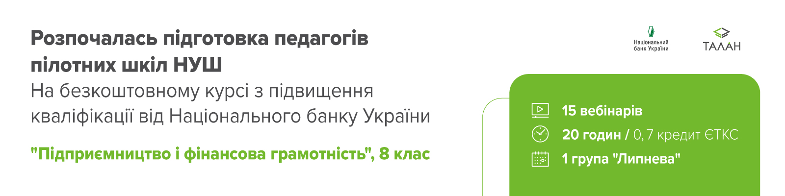 Шановні педагоги, раді презентувати вам безкоштовний дистанційний курс із підвищення кваліфікації для педагогів за напрямом “Фінансова грамотність” під назвою “Підприємництво та фінансова грамотність. 8 клас” від Національного банку України.
